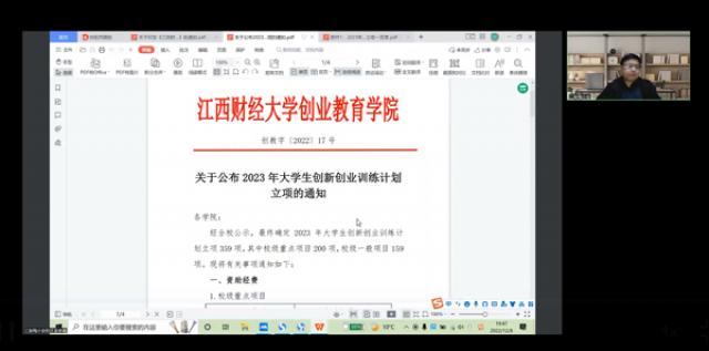 在培训会上,梅院长首先简单介绍我校近几年的大学生创新创业训练计划项目所取得的成绩和不足之处,并通报了2023年大学生创新创业训练计划项目立项申报的情况,鼓励同学们积极申报,努力创新。接着,梅院长结合立项实例详细解读《江西财经大学大学生创新创业训练计划项目实施管理办法(2022年修订)》,同时对2023年大学生创新创业训练计划项目做出了具体的安排。并对师生的提问作了细心解答,氛围良好。